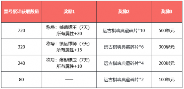 2. 玩家活动期间内累计获取总票号数量达到相应档位后,只可获取当前所在档位的奖励。如,玩家累计获得320票号,则只可获取320档位的奖励,不可获取其余档位奖励。