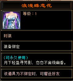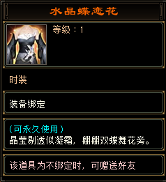 高级奖励:时装:水晶蝶恋花、时装:浪漫蝶恋花、永久坐骑:紫蝶惊鸿、定颜珠·蝶恋、水晶发型图、漫花发型图