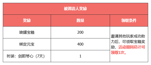 5、助力奖励:符合要求的玩家助力成功后,可领取助力奖励,200个琅嬛宝箱,400绑定元宝和时装:剑胆琴心(7天),活动期间总计可领取1次。