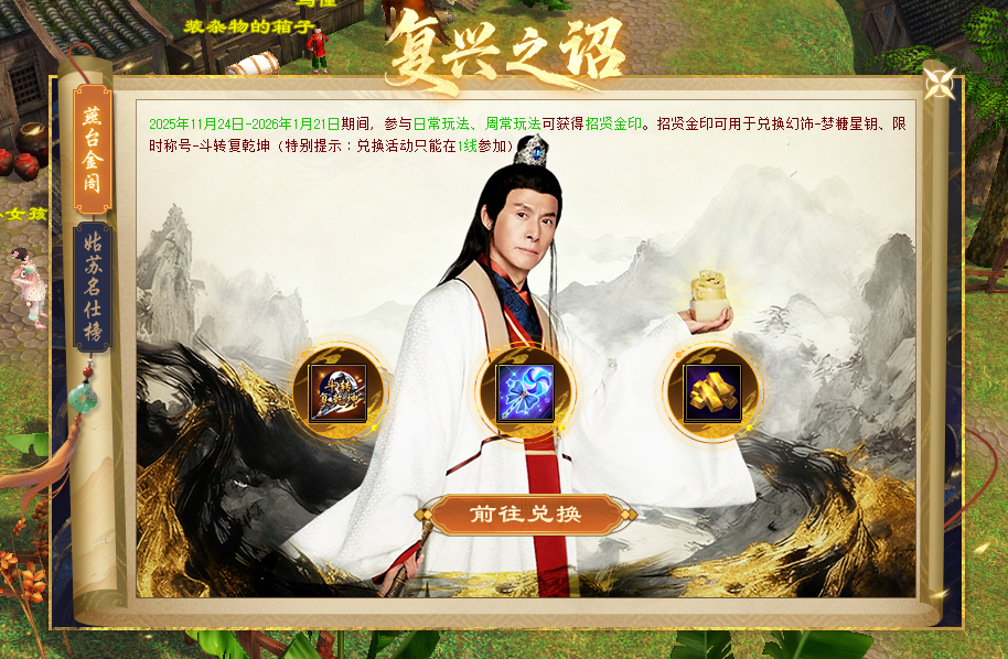1、活动期间,参与日常玩法、周常玩法可获得招贤金印。招贤金印可用于兑换绝版幻饰-梦糖星钥、限时属性称号-斗转复乾坤(所有属性+20)。