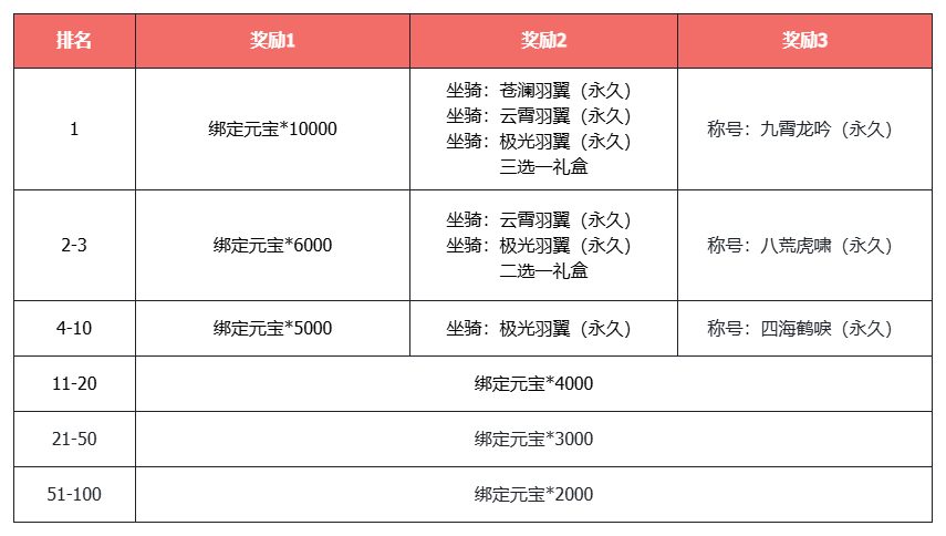 -排行榜前100名将获得夺金榜礼盒奖励,礼盒打开将随机获得1000、1500、2000、2500、3000这5个档位其中一种数量的绑元。