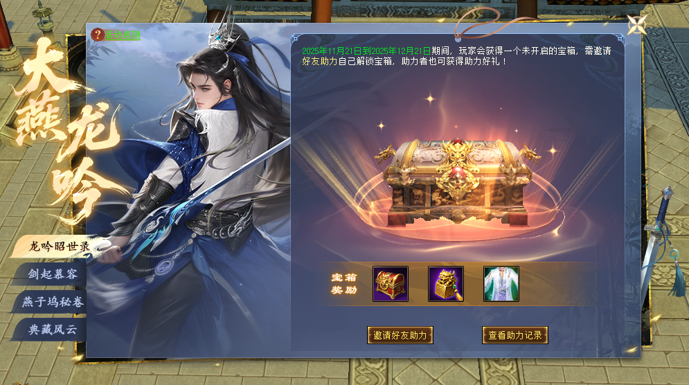5、助力奖励:符合要求的玩家助力成功后,可领取助力奖励,200个琅嬛宝箱,400绑定元宝和时装:剑胆琴心(7天),活动期间总计可领取1次。