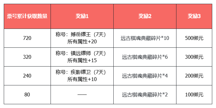 1. 活动期间内,玩家可以通过参与镖行江湖玩法的运镖、护镖和劫镖获取票号。