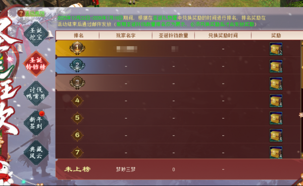 2、活动前期会根据玩家拥有的圣诞铃铛数量进行排名,最终排名是按照玩家兑换奖励时间排名,未兑换奖励不会发放排名奖励。