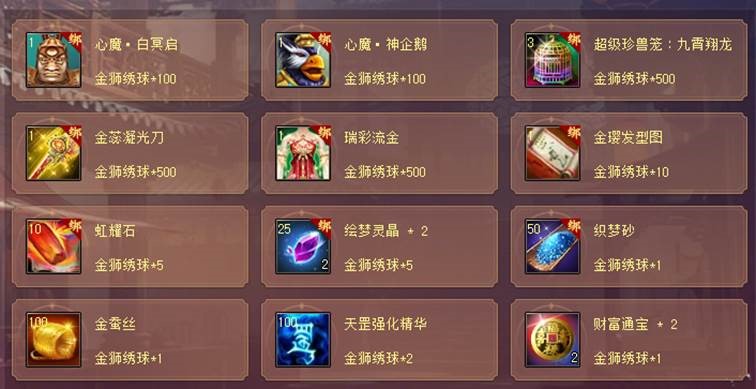 时装:瑞彩流金(永久)、金璎发型图、超级珍兽笼:九霄翔龙、金蕊凝光刀、心魔典藏•白冥启、心魔典藏•神企鹅、金狮绣球*288、金狮绣球*48、金狮绣球*18、金狮绣球*12、金狮绣球*6