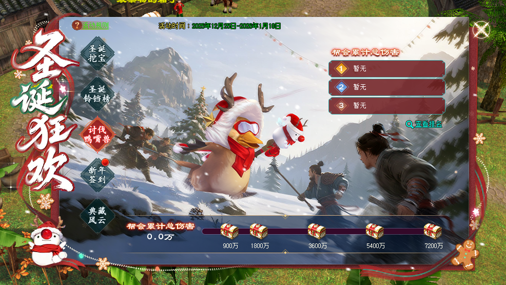 3.活动BOSS存在5分钟,只统计本帮成员对圣诞鸭嘴兽造成的伤害。