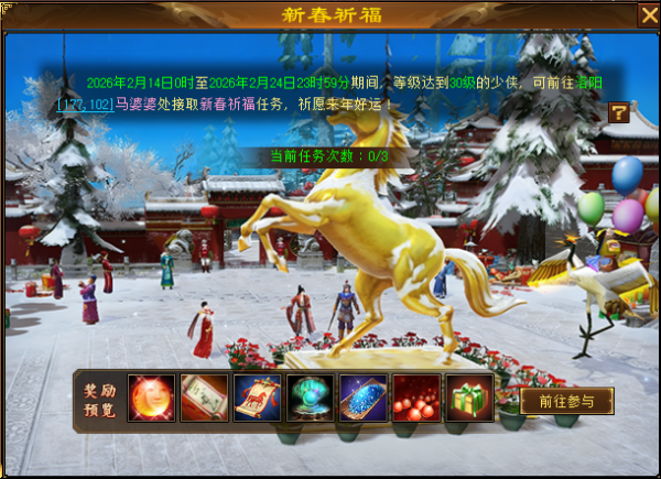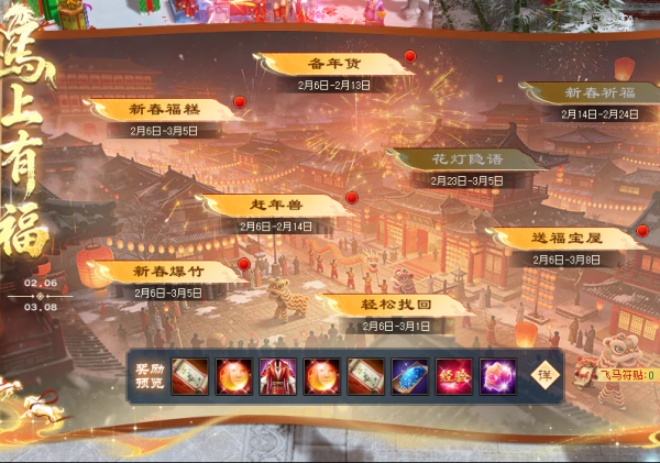 活动奖励:飞马符贴(新春爆竹道具)、织梦砂、高级根骨丹、大量经验、天罡强化精华、金蚕丝、珍兽技能书礼包