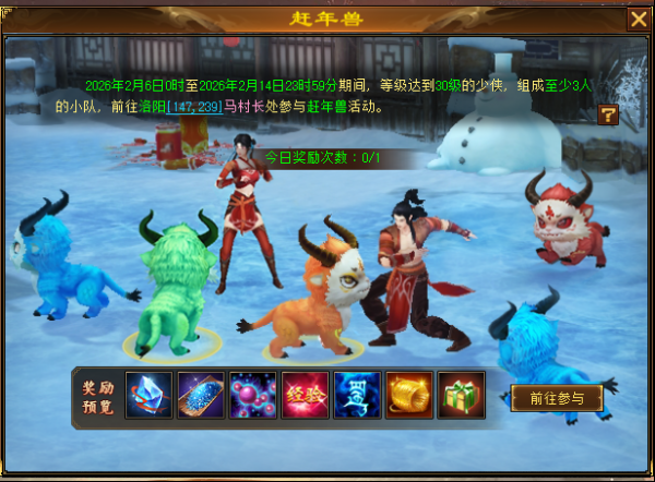 1.活动期间,等级达到30级的玩家,组成至少3人小队,前往洛阳[147,239]马村长处参加赶年兽活动。