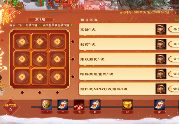 3.收集1个福糕,福气值+1;完成一行/一列收集,福气值+2;完成整层收集,福气值+4。