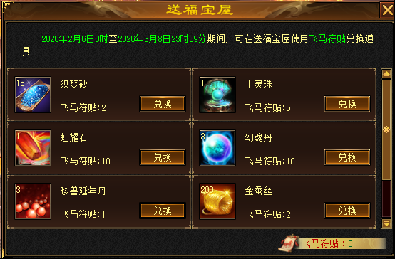 1.活动期间,可使用飞马符贴在送福宝屋中兑换道具。