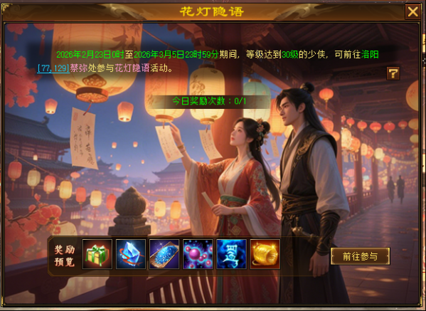 1.活动期间,等级达到30级的玩家,可前往洛阳[77,129]蔡弥处,接取花灯隐语任务。