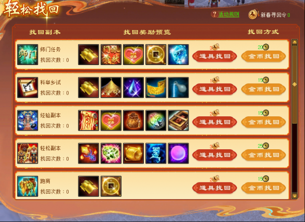 4.师门任务、科举乡试单次点击按钮找回是找回一轮奖励(即10次),且需前一日,一轮都没有做过才可以找回。