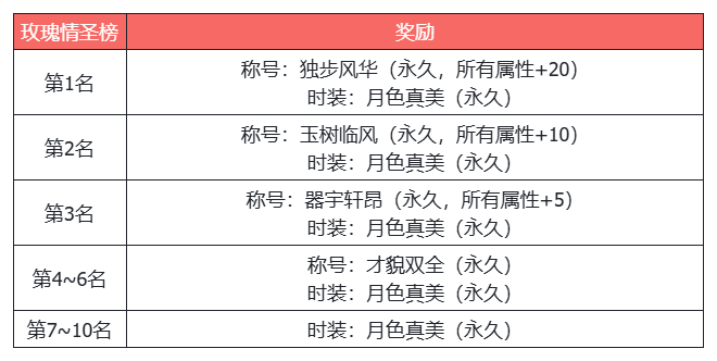 2.在新服玫瑰情圣排行榜单内,且通过男神大赛活动审核的玩家,新服玫瑰情圣指数前10名可以获得绑定奖励,奖励将在活动结束后10个工作日内发放,届时可前往大理龚彩云处领取。