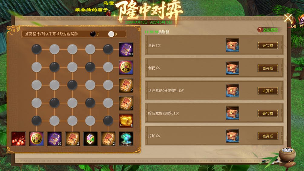1、完成每日任务可获得对弈礼包,打开对弈礼包可获得棋子(有概率获得三国随机卡包),消耗棋子点亮棋局;