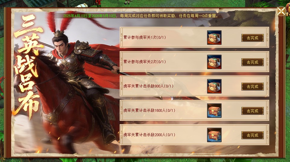 1、活动期间,每周完成虎牢关副本对应任务即可获取奖励。