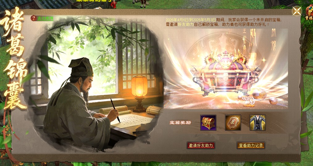 4、活动期间,每个角色只会获得1个宝箱。符合要求的可助力角色整个活动期间只有一次助力机会。